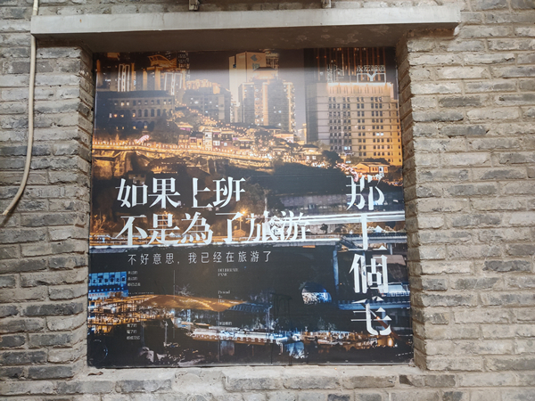 走完这才发现这三个地方都离我们住的民宿不远,就在方园一公里左右的范围,很可惜在兜兜转转走了许多路之后才发现。重庆果然不曾辜负「山城」这个称号,无论是景点的位置,还是居住的地方,都是傍山而建,往上走自然不用说,连同步行在平坦马路上时也会错愕地发现像是在爬山。在山城步道行走漫步时,曾看到台阶边有些标语戏谑写着“重庆会惩罚每一个不爱运动的人”。确实如此。无论走在任何角落,我们总是在上山或下山的路上。