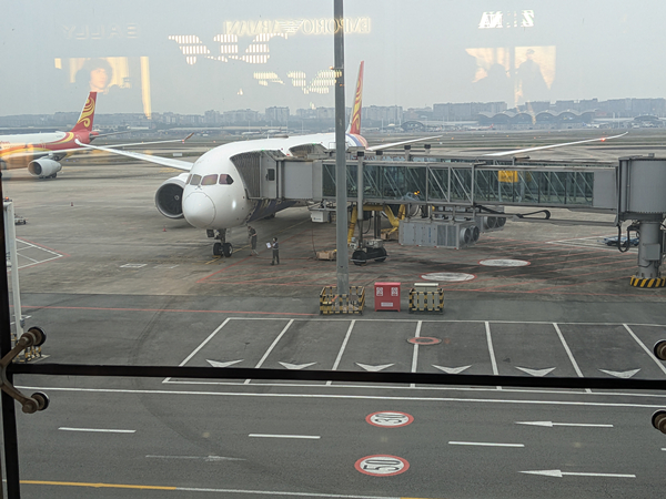 我以为重庆江北国际机场面积并不大,觉得有点出乎意料。或许是因为在去往广州白云国际机场时,整个机场硕大的面积给我留下了固定印象,以为凡是能称得上「国际机场」的机场,其占地面积都是如同广州一般硕大。但Z告诉我说其实我们只是走了T2航站楼,它不如T3航站楼那样宽敞明亮。从下机到取行李,再走到候机厅,用时不足二十分钟,反而觉得相当方便。